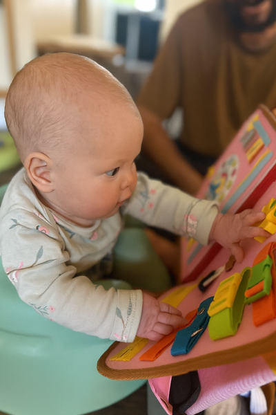 "Min 9månaders blev helt uppslukad! Så fort vi öppnade Klick & Klura började han pilla, titta och skratta. Jag älskar att se på när han lär sig genom lek. En riktig favorit här hemma!"